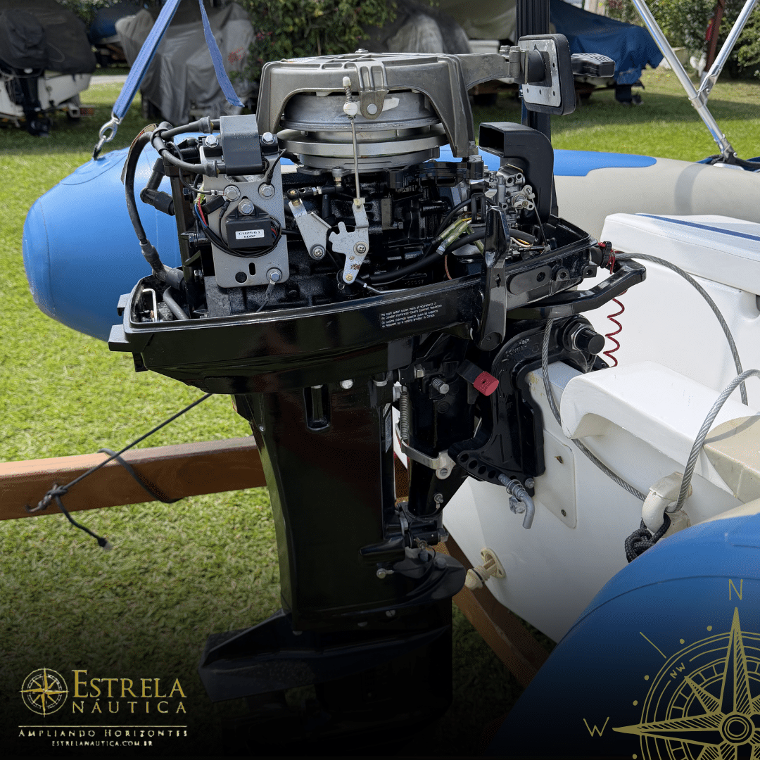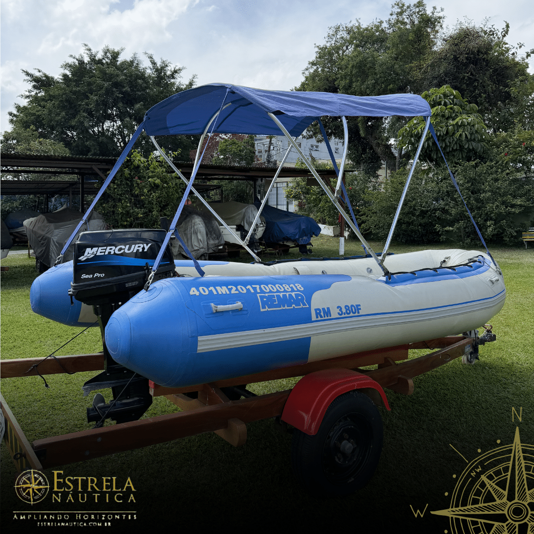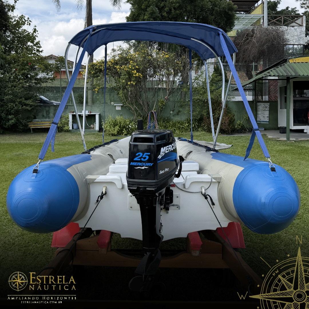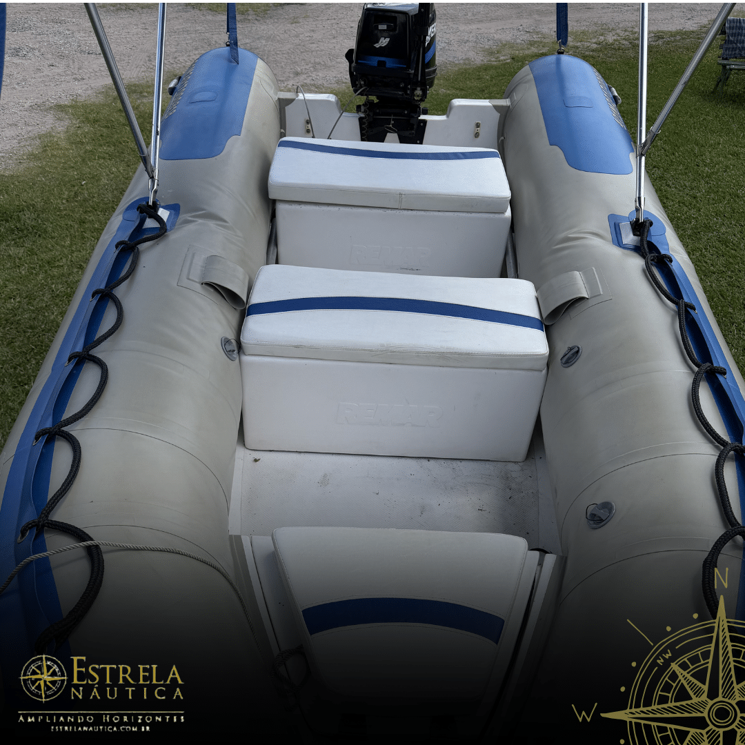 Estrutura: Caixa de proa moldada, banco tipo caixa, espelho de popa rígido e ganchos de aço inox para içamento/reboque.